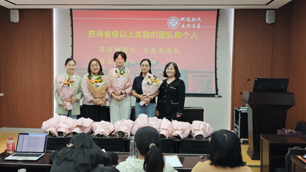 大会表彰了在省级以上教学竞赛、课程建设和科研项目中表现优秀的团队与个人。薛丽娜团队、吉奕卫团队、白玉杰团队、邢娜分别上台领奖。部副主任谢菲为获奖者颁发了鲜花和奖品,充分肯定了他们在提升教学质量和学术创新方面的引领作用。