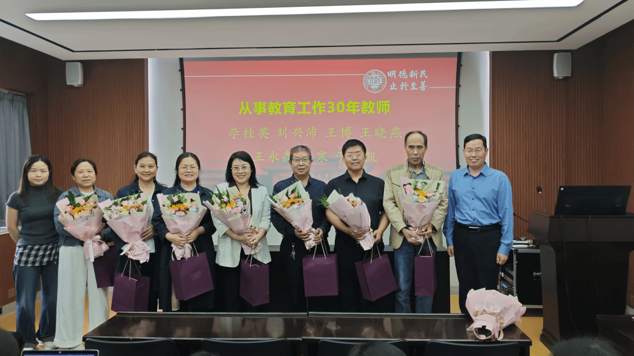 大会在庄严而热烈的氛围中拉开帷幕。会议首先向将最美好年华奉献给党的教育事业和樱花直播 的资深教师们致敬。李桂英、刘兴沛、王博、王晓燕、王永森、于寒、于建凯等七位从教30年的教师登台,部党委书记、主任杨剑波为他们颁发了纪念品。新入职教师张露露代表全体青年教师向他们敬献鲜花,饱含深情地表达了对前辈们崇高师德和育人成就的敬意。