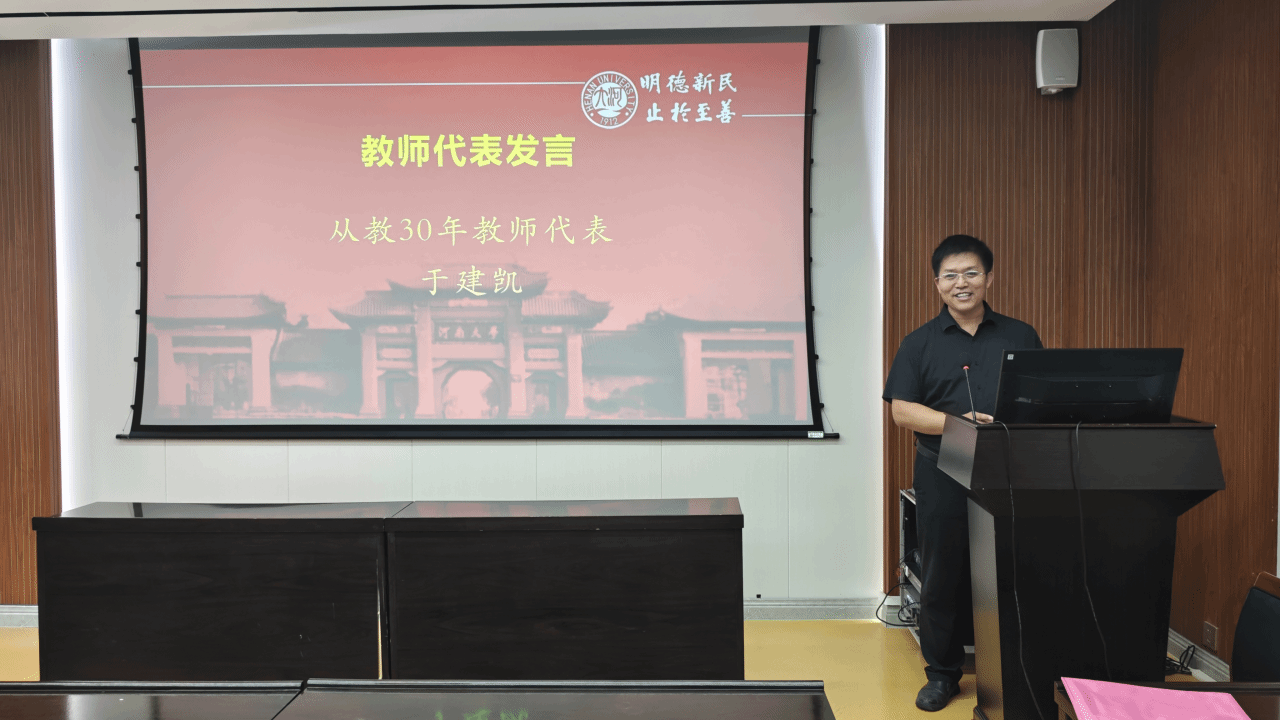 表彰环节后,获奖教师代表分享了他们的感悟。从教30年教师代表于建凯老师深情回顾了三十载执教生涯的坚守与收获,表达了对教育事业的热爱和对大外部的深厚感情。资源拓展工作先进教师代表王丹老师则分享了在推动资源拓展工作中的经验与体会,展现了新时代教师勇于担当、开拓进取的精神风貌。