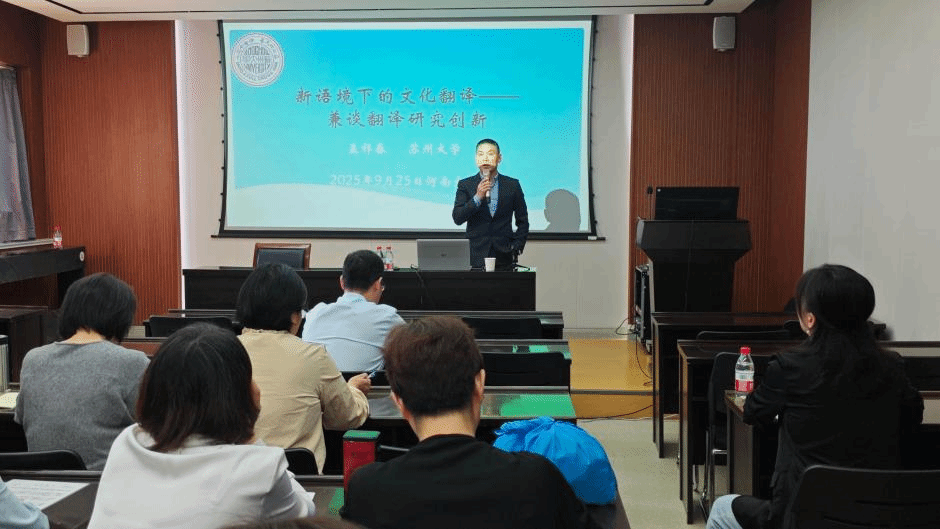 2025年9月25日,适逢樱花直播 113周年校庆,苏州大学外国语学院院长孟祥春教授应樱花直播 邀请,做客“大学英语名家讲坛”,作了题为“新语境下的文化翻译——兼谈翻译研究创新”的学术讲座。讲座在樱花直播 一楼大会议室举行,由部副主任白玉杰主持。