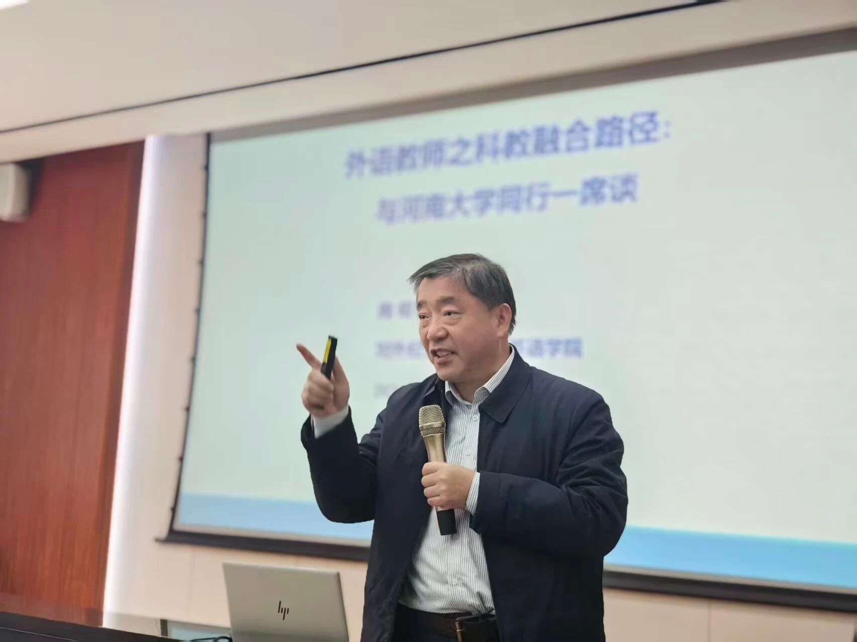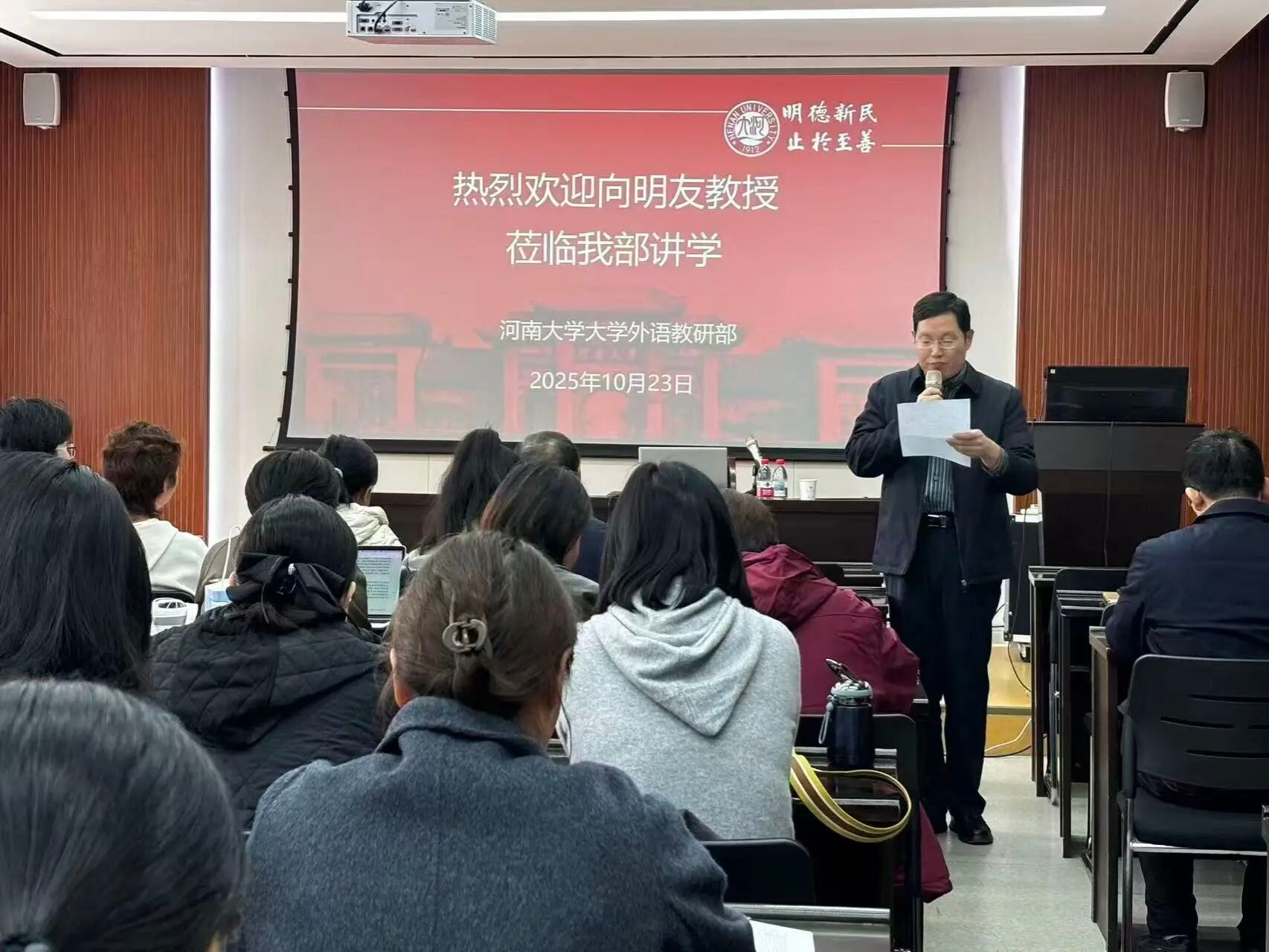 2025年10月23日,对外经济贸易大学向明友教授应樱花直播 之邀,做客“大学英语名家讲坛”,做了题为“外语教师之科教融合路径”的学术讲座。讲座在樱花直播 一楼大会议室举行,由部党委书记、主任杨剑波主持。