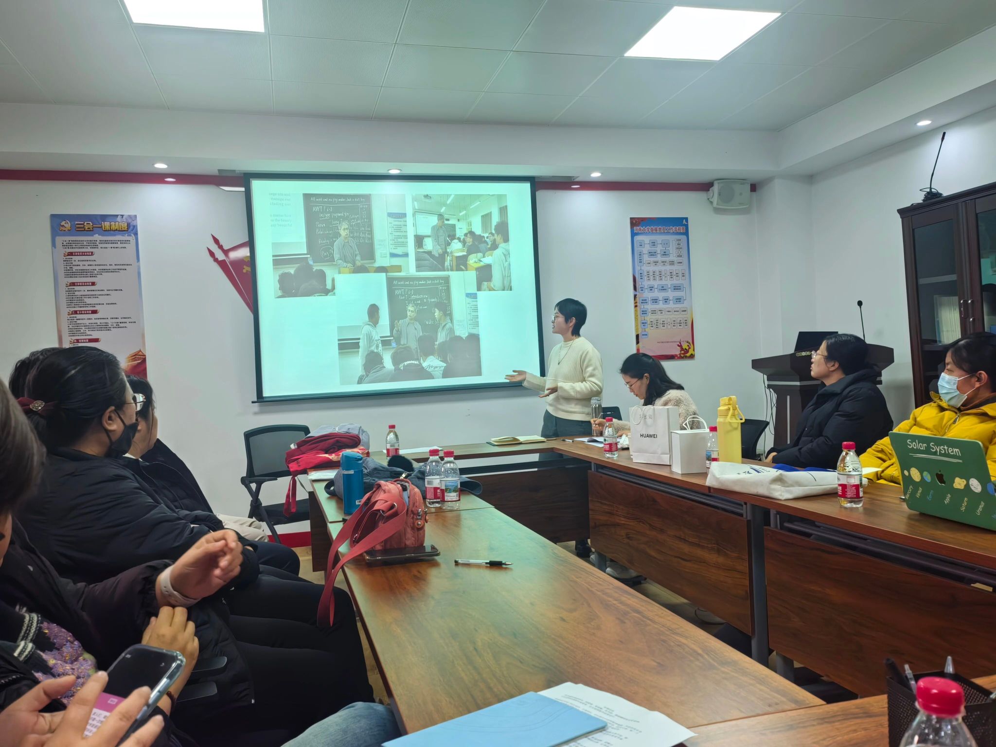 接着,安琪老师分享了她在听课过程中发现老师们的“精彩时刻”:郭皓老师的课堂设计巧妙、学生参与度高;周俊敏老师面带微笑、讲课细致深入,让学生如沐春风;胡爱强老师精神饱满,备课充分,课堂讲授游刃有余;王伟老师带着学生边讲边练,注重夯实学生的基础技能;王玲老师和蔼可亲,对于学生难以把握的重难点不厌其烦地耐心讲解;务亚宝老师的课堂充满活力,教学设计别出心裁。
