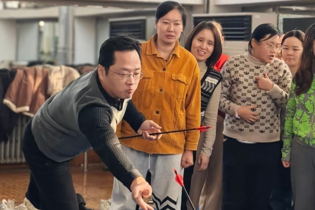 运动会的五个比赛项目设计巧妙,集趣味性、协作性和挑战性于一体,充分考验了老师们的个人技巧与团队默契。作为开场项目,投壶这项古老而优雅的游戏迅速让赛场安静下来。老师们凝神静气,瞄准壶口,沉稳投掷。每一次投中,都引来全场热烈的欢呼与掌声。在踢毽子接力项目中,彩色的毽子在空中划出优美的弧线。这项比赛不仅是个人脚上功夫的展示,更是团队衔接流畅度的考验。老师们身手矫健,配合默契,在完成踢毽与手脑挑战的接力中,将现场气氛推向了一个小高潮。蒙眼转圈再投球无疑是全场笑声最多的项目。老师们蒙上双眼,原地转圈后已是方向难辨,只能依靠队友的声音指引,摸索着将乒乓球投出。此起彼伏的提示声与投偏后的欢笑声交织在一起,深刻体现了团队成员间的信任与扶持。飞盘打水项目中,飞盘在空中旋转飞向目标,每一次精准的命中都伴随着阵阵喝彩。这个项目让老师们在运动中释放了压力,享受了投掷的乐趣与成就感。作为压轴项目,“流星赶月”对团队配合的要求最高。小小的乒乓球在老师们手中的桶间飞速传递,紧张刺激。各队争分夺秒,策略各异,将团队协作精神发挥得淋漓尽致,现场加油声、呐喊声此起彼伏,气氛热烈至极。
